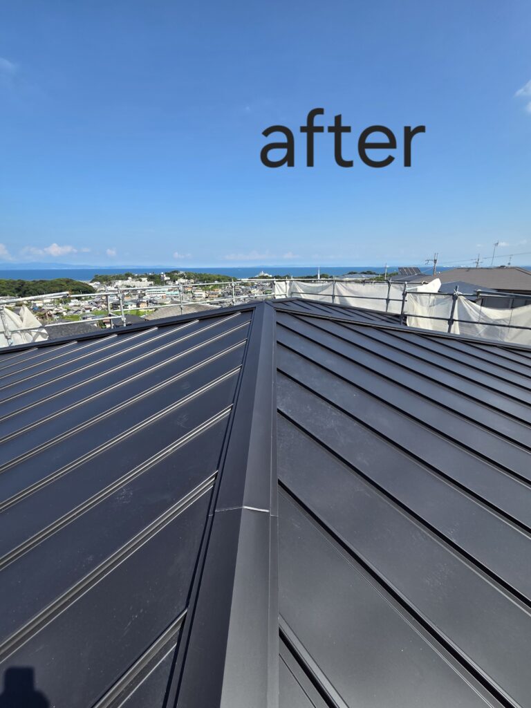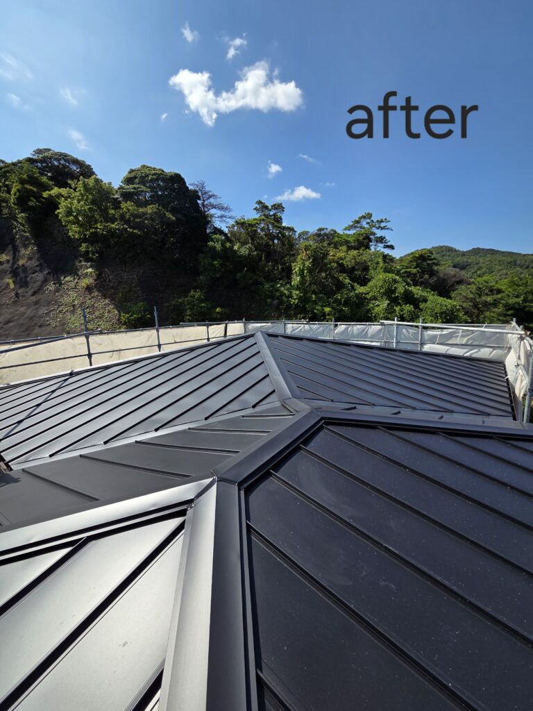 古い屋根を取り壊さず、新しいガルバリウム鋼板を重ねて施工。遮音性・断熱性が向上し、耐久性も抜群!特長: